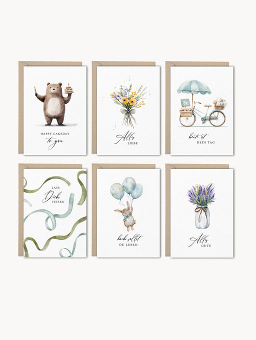 Dieses Set enthält 6 Grußkarten im DIN A6 Format – jede Karte zeigt ein liebevoll gestaltetes Aquarellmotiv mit einem passenden Geburtstagsgruß. Di...