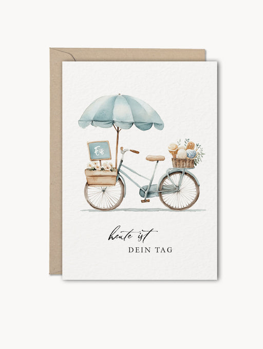 Grußkarte im DIN A6 Format mit einem Eisfahrrad im Aquarellstil und der Aufschrift „heute ist Dein Tag“. Eine schöne Karte zum Geburtstag oder auch...