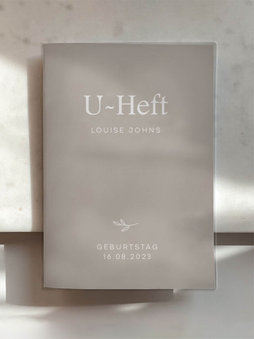 Das greigefarbene, minimalistische Design verleiht Deiner personalisierten Hülle einen zeitlosen, eleganten Look. Ob als U-Hefthülle, Impfpasshülle...