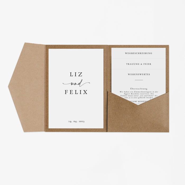 Diese Hochzeitseinladung ist etwas ganz besonderes! Die Einladung enthält alle wichtigen Infos, gesammelt in einem Folder. Die Zusatzkarten können beliebig gefüllt werden. Beispielsweise mit einer Anfahrtskarte oder einem Ablauf, Adressen, Geschenkwünsche, Dresscode, Infos zur Übernachtung.